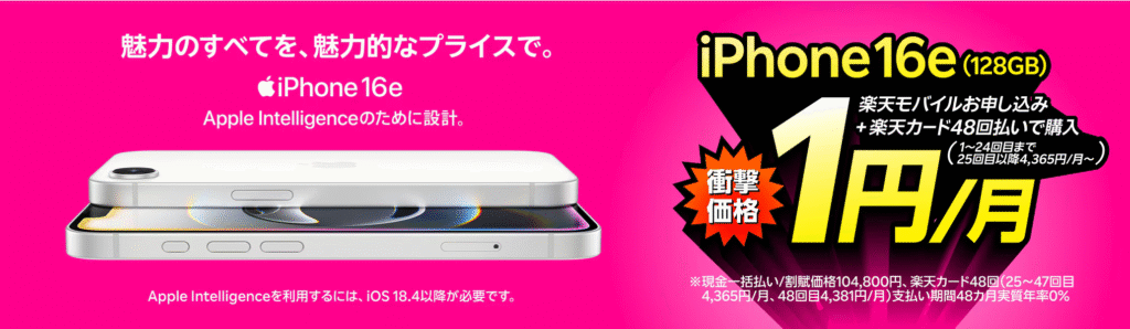 楽天モバイルでは、対象の iPhone16e 128GBモデルが実質月1円 で利用できるキャンペーンも登場しました。