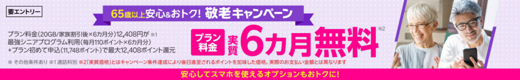 • 敬老キャンペーン:65歳以上ならプランもオプションも6カ月実質無料