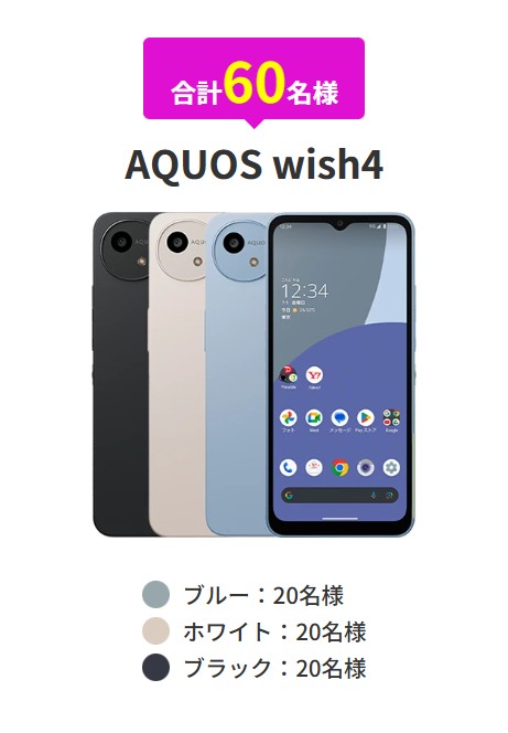 エントリーした方の中から抽選で、「AQUOS wish4」または「OPPO A79 5G」のSIMフリースマホをプレゼントいたします。