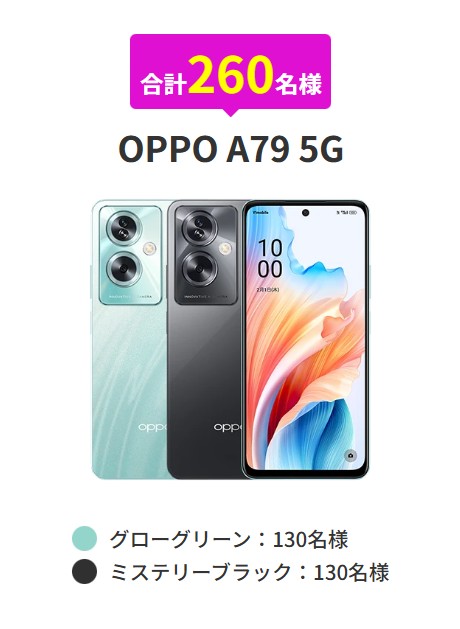 エントリーした方の中からSIMフリースマホ(「OPPO A79 5G」または「AQUOS wish4」)を抽選でプレゼント。